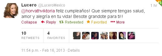 Ha nem bántjátok, felteszem azt a képet, amitől nagyon boldog lettem.:D A gyönyörű mexikói díva Lucero Hogaza felköszöntött születésnapom alkalmából twitteren. Amikor megláttam majdnem elájultam. Tavaly a mi királynőnk Gaby is felköszöntött, ha nem bánjátok azt is felteszem. Remélem ma is felköszönt :)